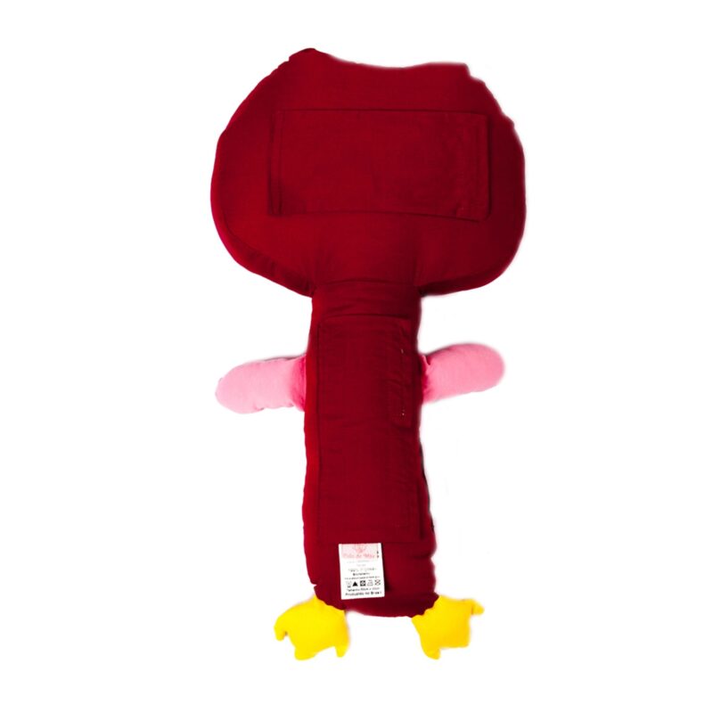Almofada divertida e anatômica, permite que as crianças abracem a almofada e fiquem muito mais confortáveis. Possui velcro atrás facilitando a fixação no cinto. Evita que o cinto machuque o pescoço ou que a criança retire a alça de proteção do tórax. Com bolsos na frente para colocar óculos, brincos, celulares ou brinquedos. A viagem fica muito mais divertida e as mamães menos preocupadas.