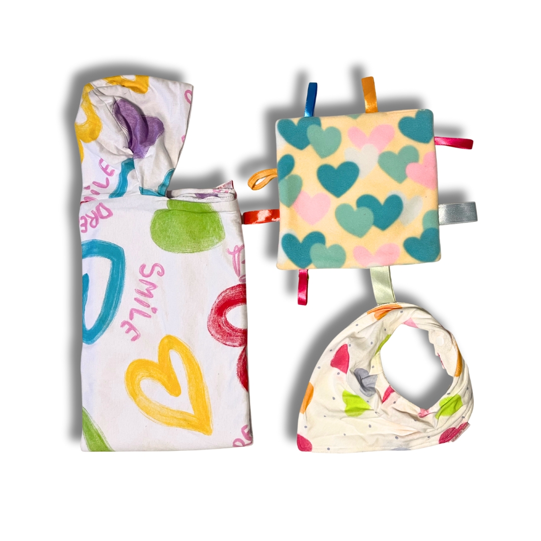 Esse kit contém Toalha de banho tamanho bebê, naninha Urso Rosa, babador bandana e manta sensorial de corações.